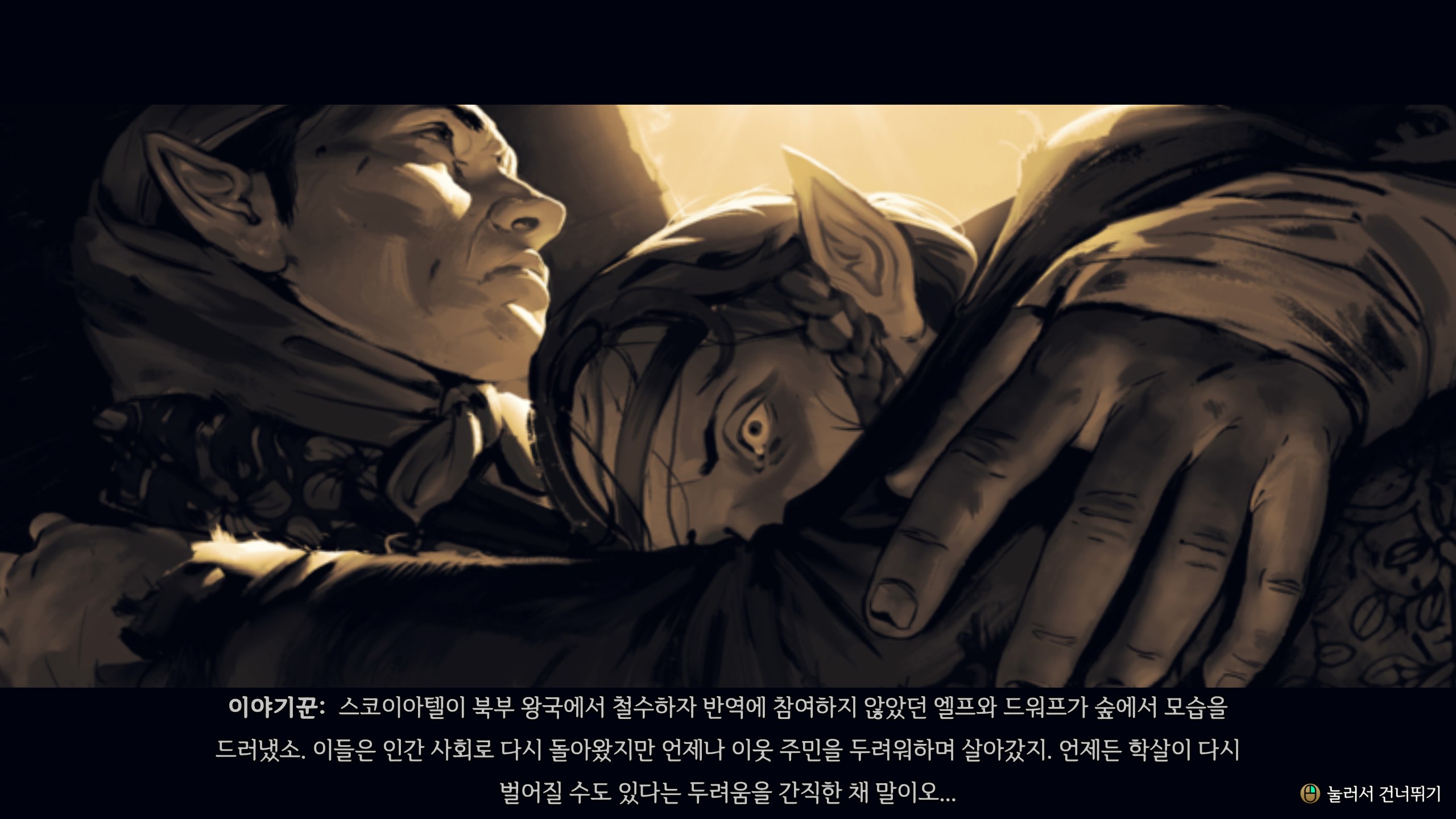 다만 위쳐2에서 이오베스 루트를 탈 정도로 스코이아텔에게 동감하는 지점이 있었는데, 쓰론 브레이커는 계속 반엘프 선택지를 누르게 되어... 나의 신념은 상황에 따라 별거 아니구나 이런 씁쓸한 생각도 하게 되었음.