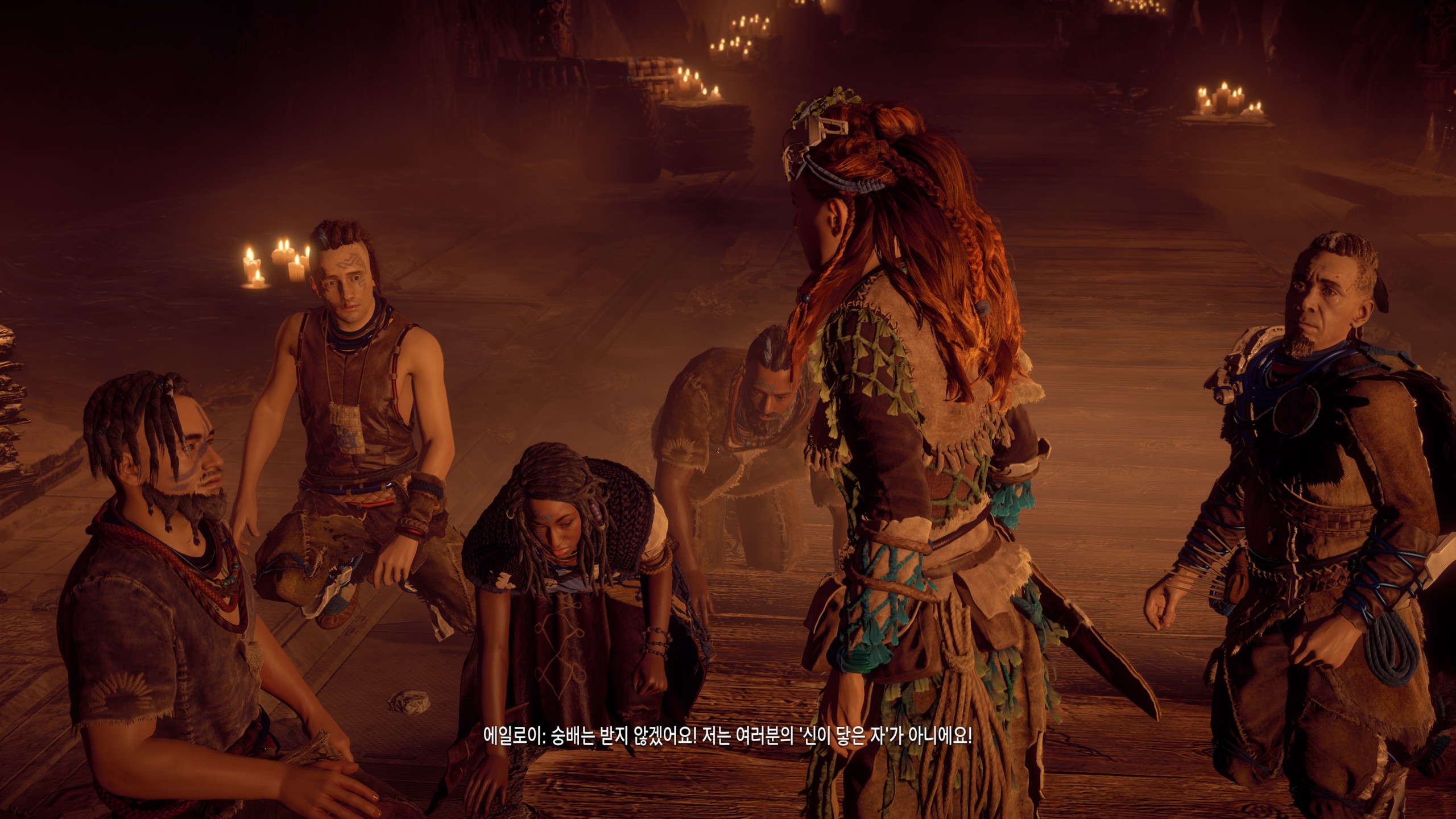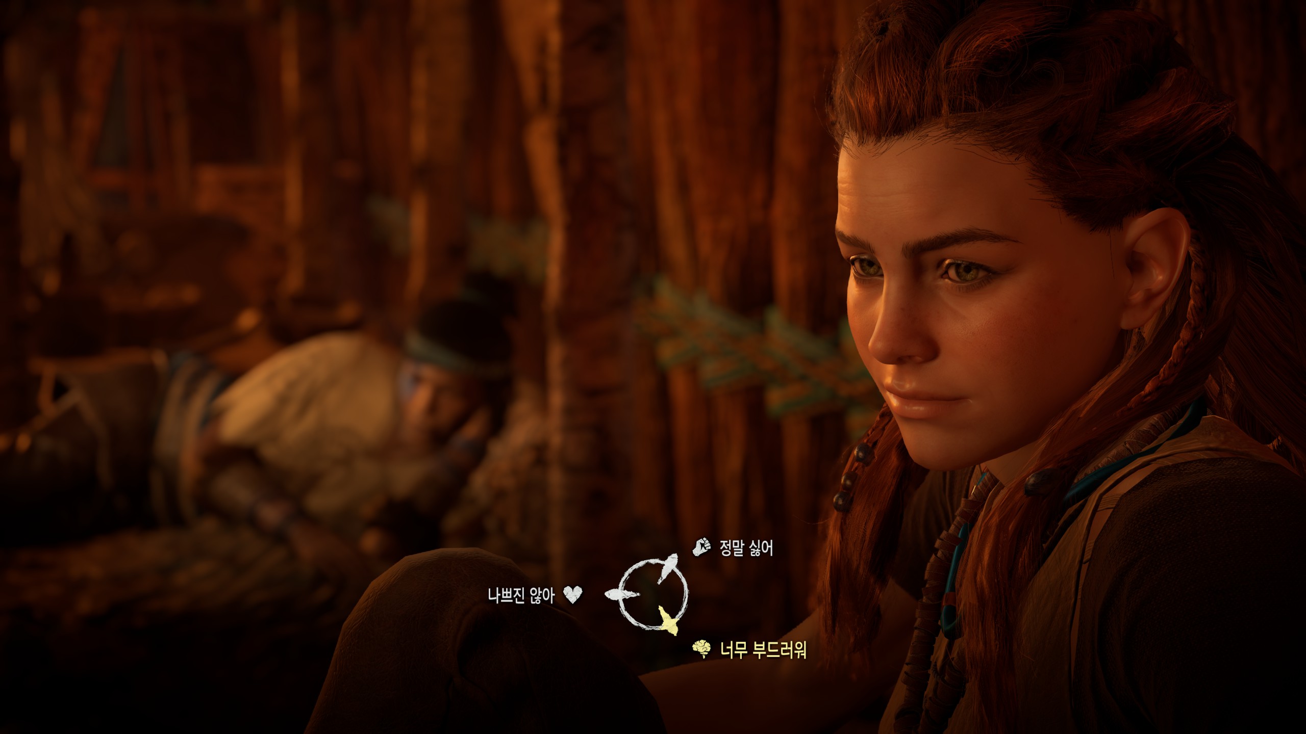 그럼 마을같은 비전투지역에서라도 뭔가 마음 놓을 곳이 있으면 좋은데, 가장 대화가 많은 NPC조차 에일로이의 편이 아니며, 마을 지역 내에서도 에일로이를 위한 공간이 없었다(이후 뒤로 갈수록 집이라도 한 채 주지 싶었다 위쳐도 집이 있고 폴아웃3의 방랑자도 집이 있는데!).