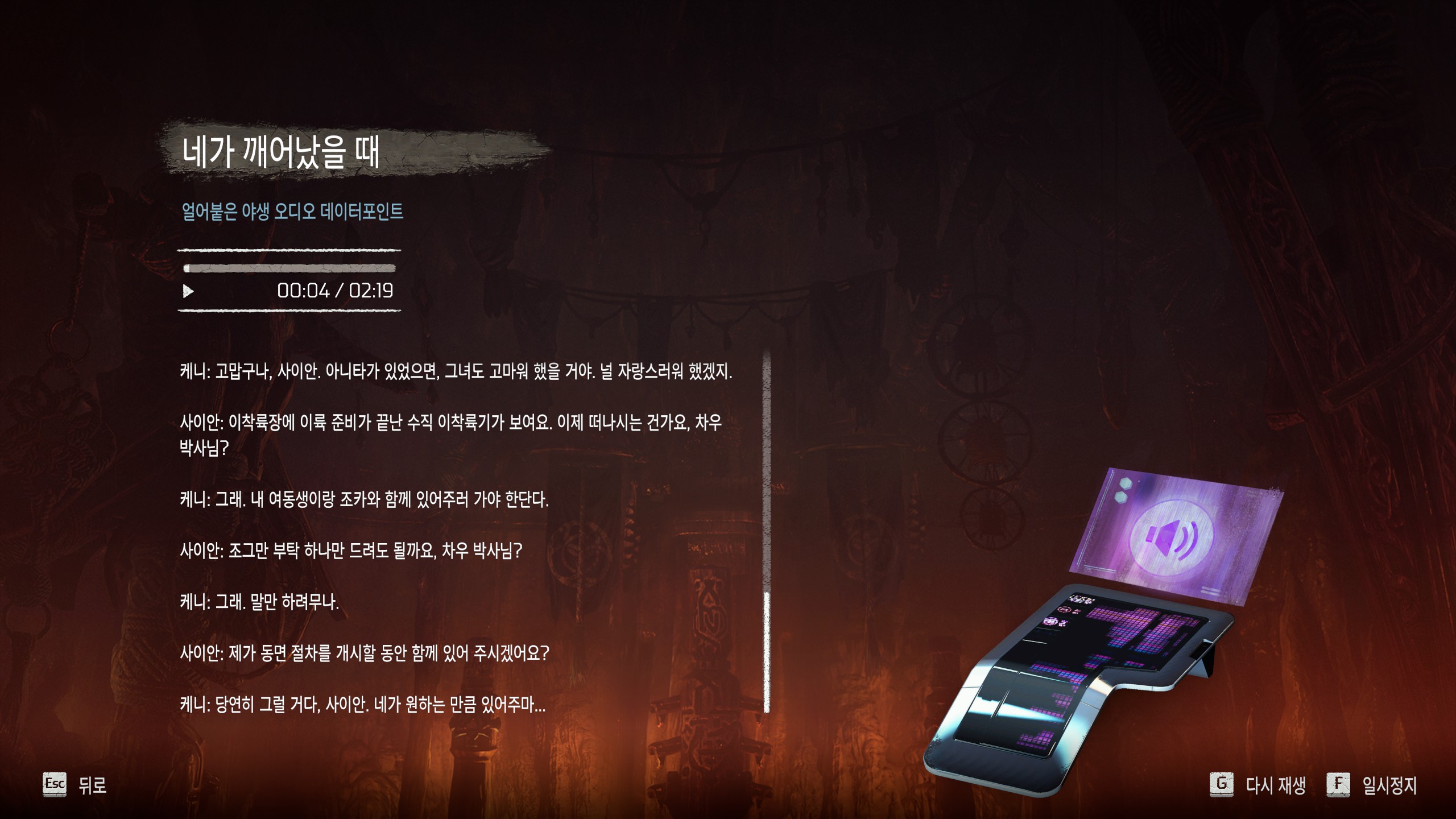 전 세계에 흩어져있는 고대인들의 정보는 세계관, 스토리와도 직접 연결되는 중요한 자원들이다. 하지만 2분이 넘는 오디오 파일을(개열받게 다른 NPC/이벤트의 방해를 받으면 끊겨버림) 가만히 듣고 있는 것이 최선이었는지에 대해서는 의문이 있다.