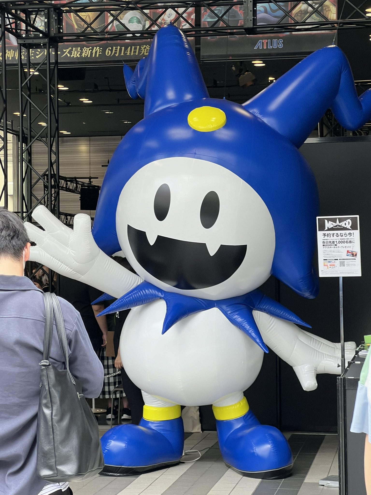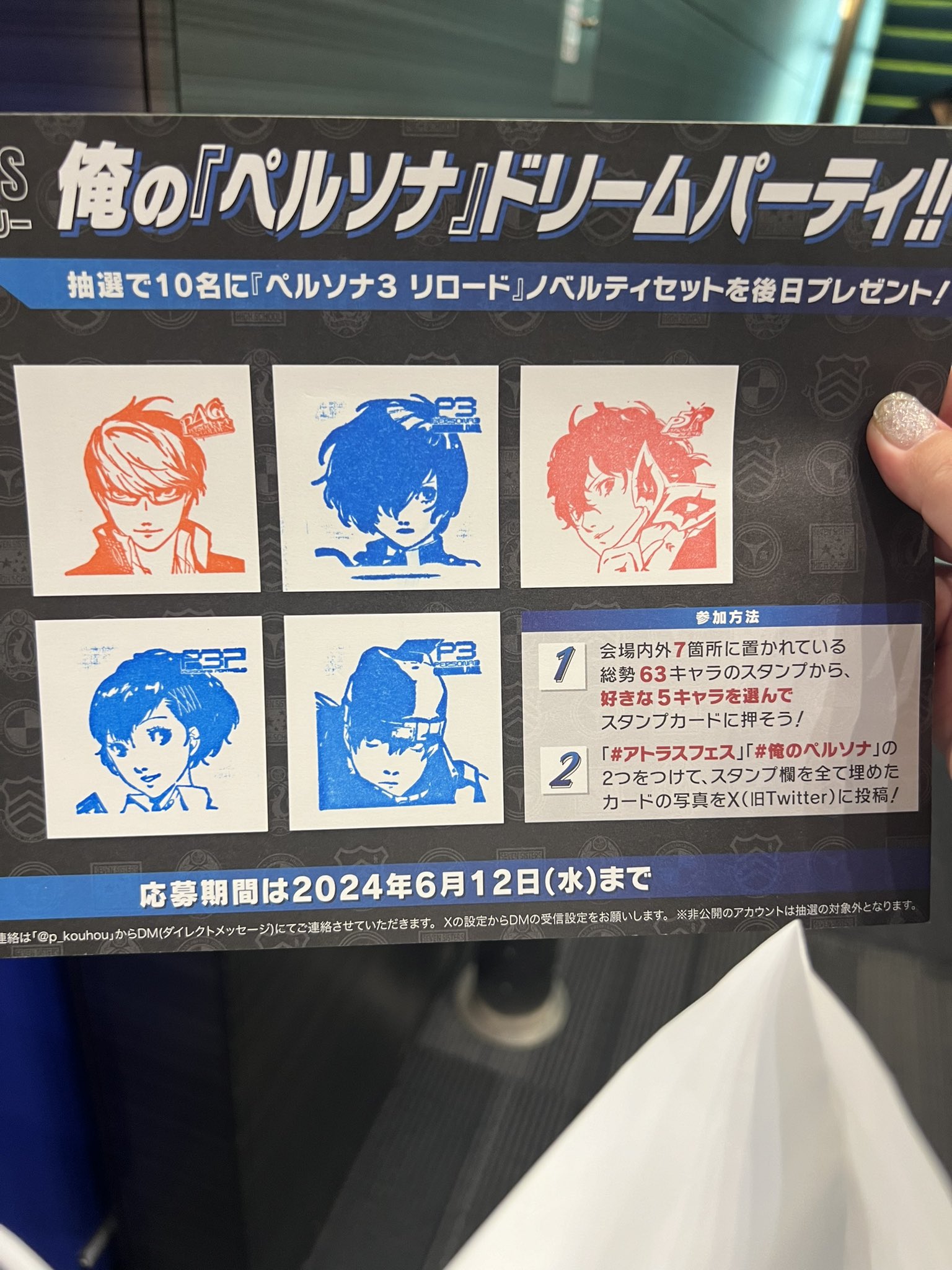 무료로 나눠주는 잭 프로스트 가면도 받고, 최애캐 도장찍기 이벤트에도 참가했다. 줄을 여기저기 분산시킬 목적이었는지 페르소나 전체 캐릭터들을 도장으로 만들어서 여러 위치에 배치시켜놓은 이벤트였다. 트위터에 찾아보니 역시 착한 팬이 도장 스팟마다 캐릭터가 어떻게 배분되어 있는지 알려주었다. 친절한 트위터 페르소나 팬들. 줄 서면서 페르소나 등신대도 구경했다.