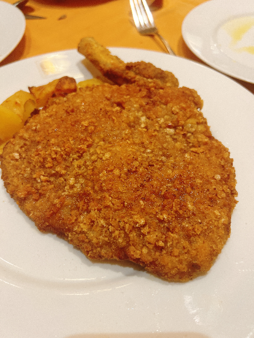 밀라노 전통 음식 코톨레타(Cotoletta) 질깃한 커틀렛이다. 소스가 없어서 먹는데 힘들었다. 소스를 요청했는데 뜨거운 그레이비 소스가 나와서 먹기 더 힘들어졌다.