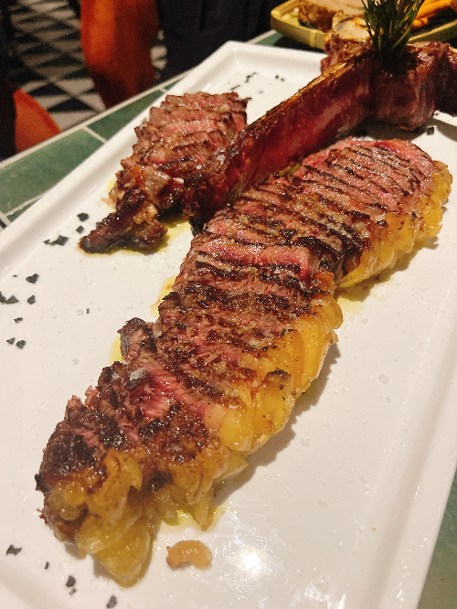 티본 스테이크였는데 품종은 그냥 추천 받은 것으로. 노란 색의 지방에서 알 수 있듯이 한국과는 향도 맛도 좀 다르다. 어떻게 다르냐면.. 이쪽이 좀 더 와일드하다. 생소한 육향이었다.