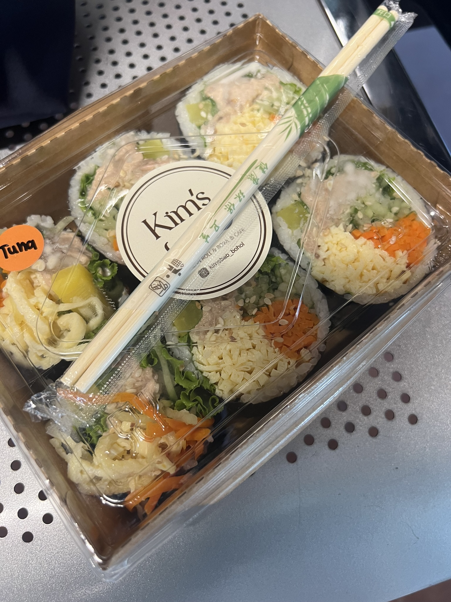 보홀 팡라오 공항에는 한인이 운영하는 김밥집이 있다. 라면도 여러 종류를 팔고 있고...(얼마나 한국인들이 많이 오는지 한 눈에 알 수 있다). 김밥이나 샌드위치는 기내에도 반입 가능하다. 우리 어머니는 쉽게 상할 수 있는 김밥엔 손도 대지 않겠다고 하셨지만, 결국 내가 먹고도 멀쩡한 걸 보고 기내에서 함께 드셨다. 나도 개도국 경험이 좀 있어서 해외 출장 시 생야채가 들어간 음식은 잘 먹지 않는데, 한인이 운영하는데다가+아직 인터넷 상에서 먹고 탈난 사람은 없는 것 같아 믿고 먹었다. 간은 좀 심심한 편.
