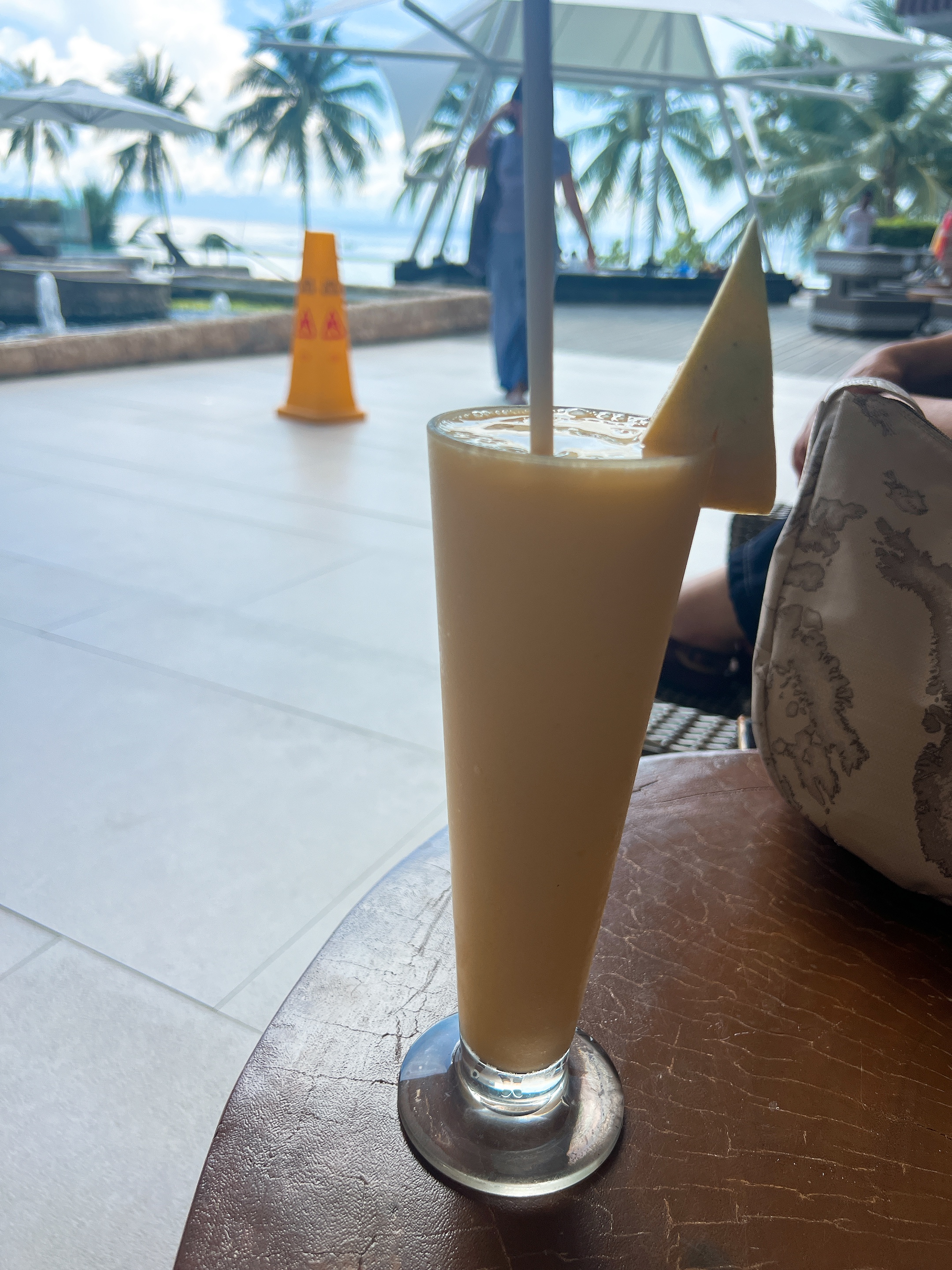 헤난 리조트는 에어컨이 나오는 로비에 소파도 많았고, 웰컴 드링크도 직접 자리로 가져다 주었으나, 모달라 비치 리조트의 경우 아래 층에 있는 레스토랑에 내려가서 쿠폰을 보여 주고 웰컴 드링크를 받아야했다. 그런데 레스토랑에도 자리가 애매하게 남아 어쩔 수 없이 해변에 있는 썬베드에 누워서 기다렸다.
