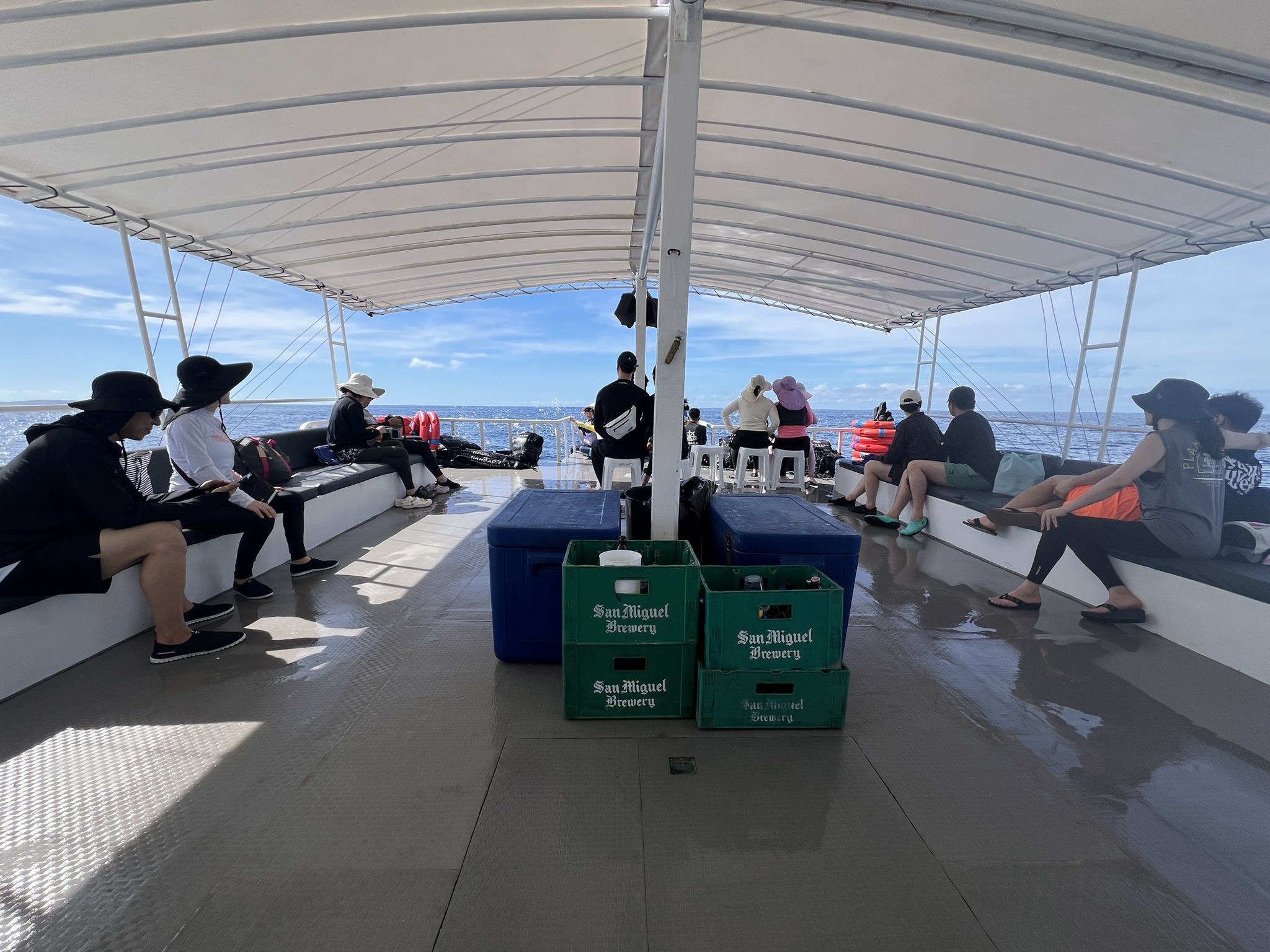 처음에는 작은 보트를 타고, 해 바깥으로 나와 사진의 저 큰 배로 갈아탄다. 고객은 아이들을 데려온 (대)가족, 부부 등이 대부분이었다. 극성수기였기 때문에 한 타임에 25명 정도 되었던 것 같은데, 저 배에 딱 맞게 앉을 수 있다.