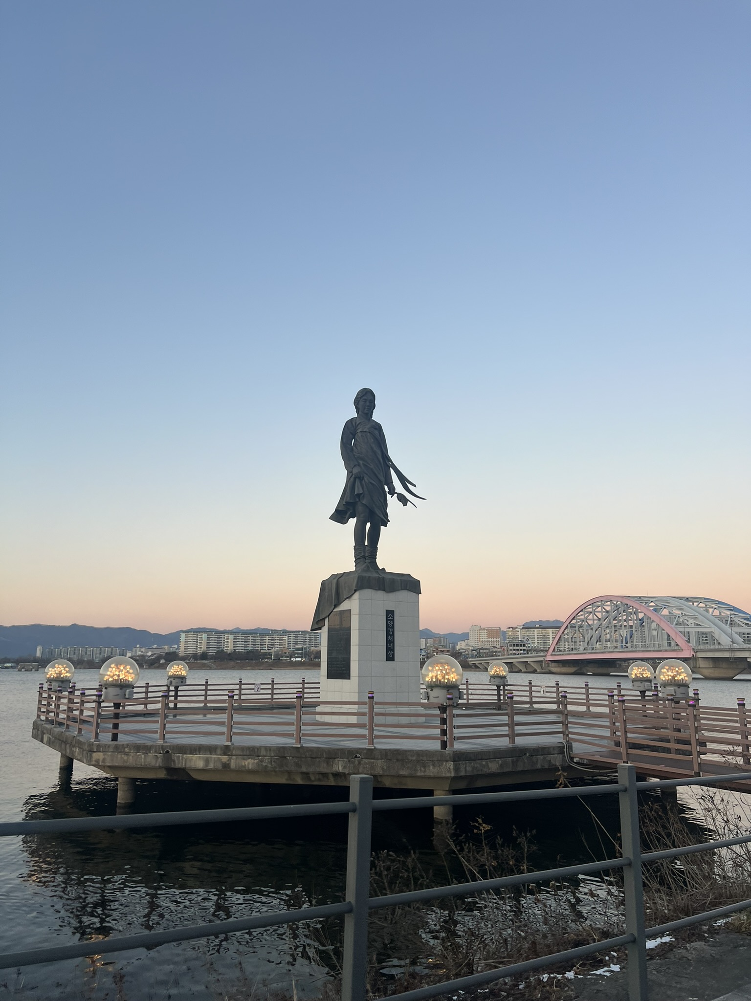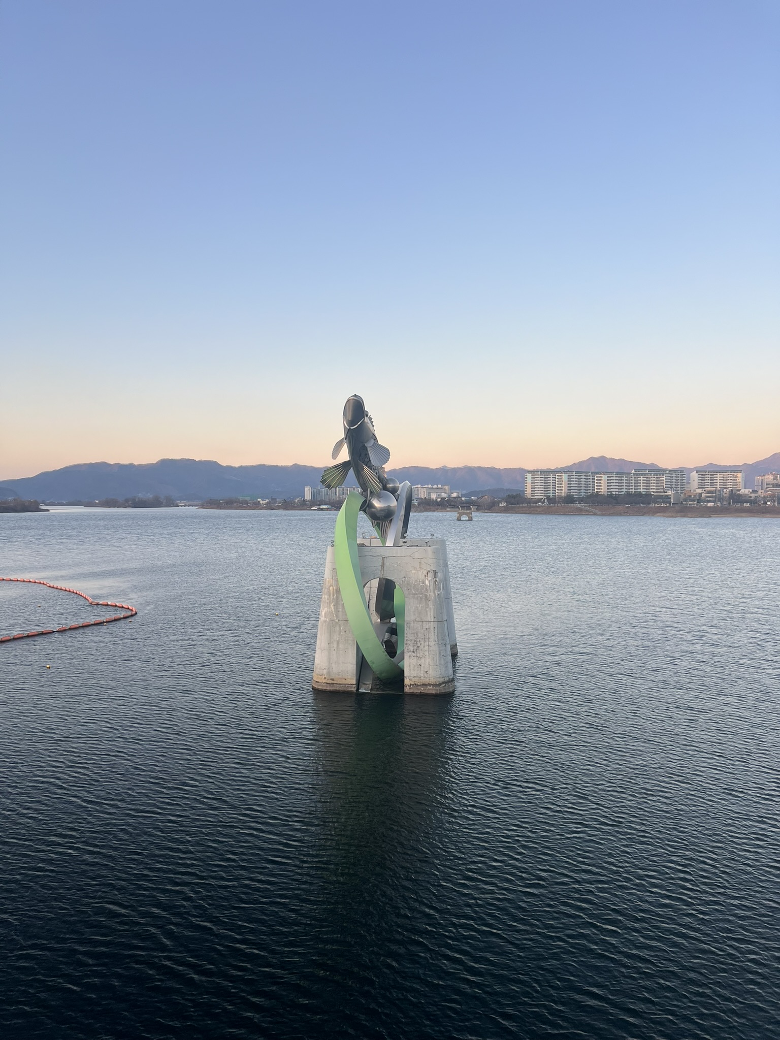 먹었으니 또 걸어야겠지... 소양강스카이워크를 보러 왔다. 내 기억에 여긴 친구의 루트에 들어있지는 않았는데, 지나가다 거대한 소양강 처녀상을 보고 가자! 해서 들렀던 것 같다. 이 때 12월 말인데다가 강 바람이 엄청 불어서 추웠고 사람도 없었다. 하지만 거대한 잉어... 쏘가리상을 지나칠 수는 없었다. 입장료 2천원을 내니 춘천사랑상품권으로 돌려줘서 다음날 대원당에서 빵 사는데 보태썼다.