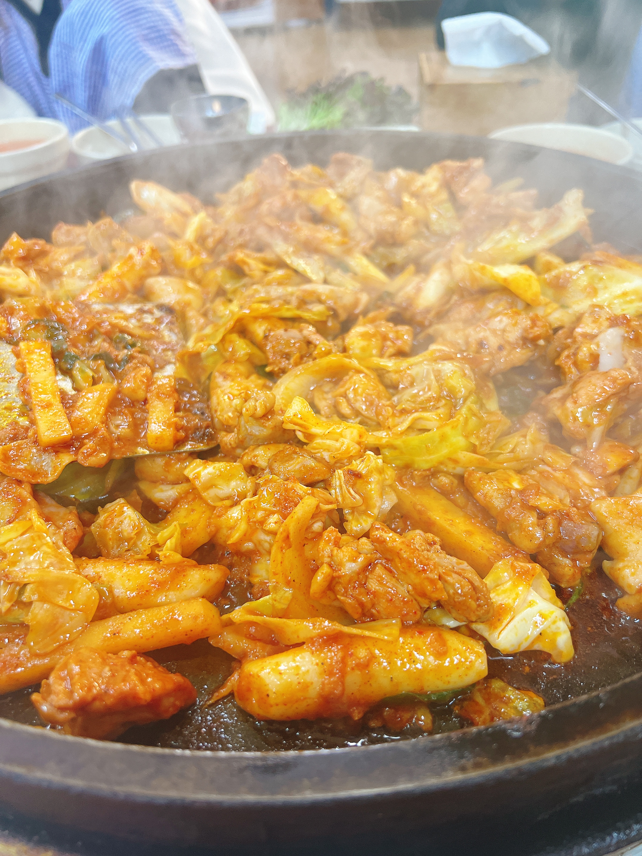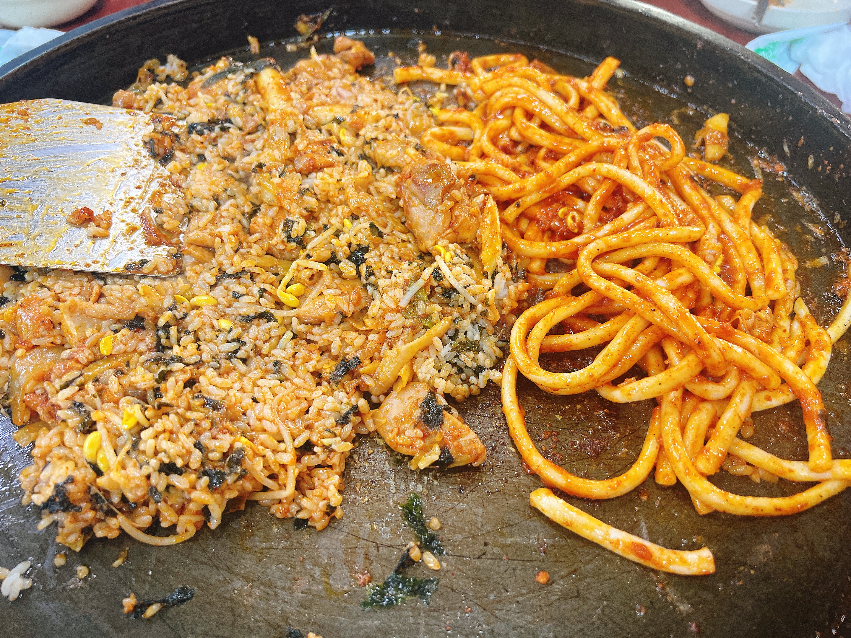 신선하고 맛있는 닭갈비였다. 누가와도 맛있을 가게! 서울과 달랐던 부분은 1) 닭갈비를 먹을 때 철판을 태워서 밥 볶을 때 따로 벗겨낸다, 2) 면 사리를 고기와 볶는 게 아니라 밥과 볶는다, 3) 면 사리가 우동사리가 아니라 뚝뚝 끊어지는 면이다. 먹고 나서는 깔끔하게 잘 먹었다 하는데 돌아서면 어 더 먹을 수 있을 것 같은데? 하는 맛이다.
