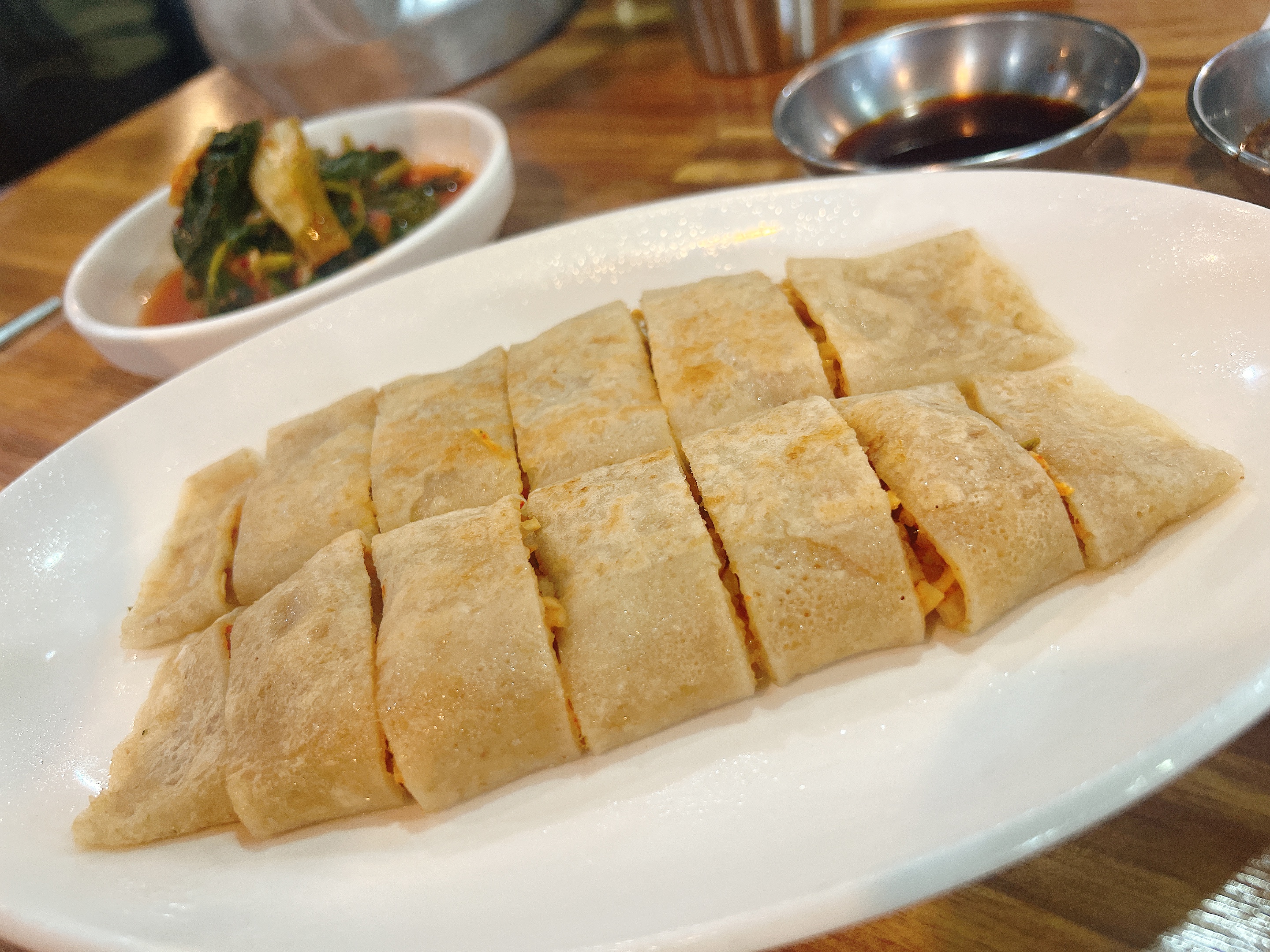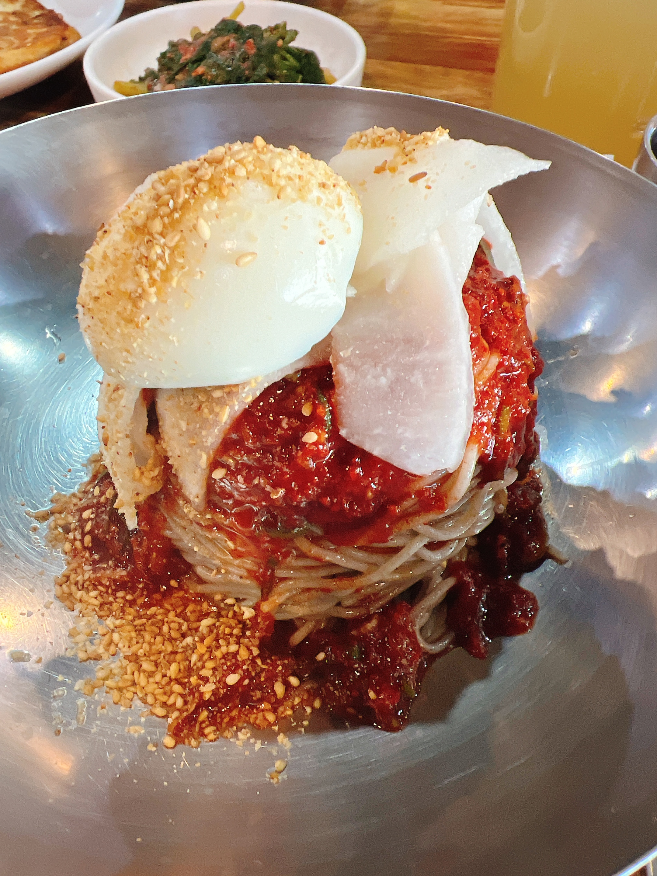 마지막으로 남춘천역에서 ITX를 타기 전 점심을 먹었던 퇴계막국수. 들어보니 춘천에는 수많은 막국수집이 있고, 이 가게들에는 문파(...)가 있는 모양이다. 누구의 가족이 나와서 어디를 차리고, 직원이 어디를 계승하고. 막국수집들의 특징도 다 다르고. 퇴계막국수는 친구와 가족들의 엄정한 심사를 통과한 곳이었는데, 막국수가 진짜, 진짜 맛있었다. 나는 사실 막국수 종류를 많이 먹어보지 못했는데 이렇게 쑥쑥 들어가는 음식인가 싶었다. 다만 다른 지역과 다른 점은 살얼음이 낀 육수를 부어서 물비빔냉면처럼 먹는 것. 난 사실 국물없이 쓱쓱 비벼서 먹는게 익숙하고 좋아서 많이 안 넣었는데, 친구가 엄청 안타까워했다. 하지만 안 넣어도 맛있었다...!