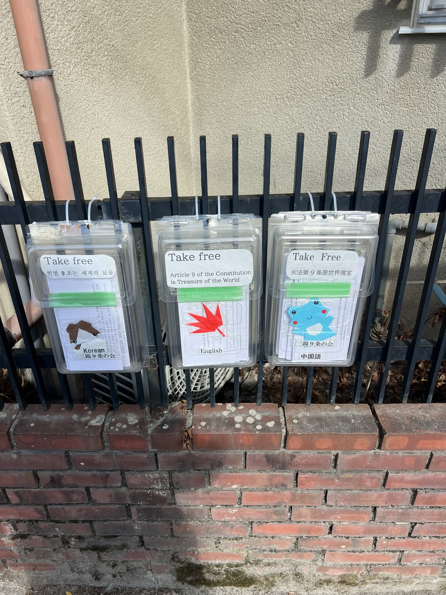 그리고 길을 걷다가 어느 집에 이런 게 설치되어 있는 것을 봤다. 일본 내부에 이런 의견을 공개적으로 내는 사람이 있구나. 갑자기 마음이 따뜻해졌다. 뭐라고 남기고 싶었는데 펜이 없어서 못했다. 좋은 글 감사합니다.