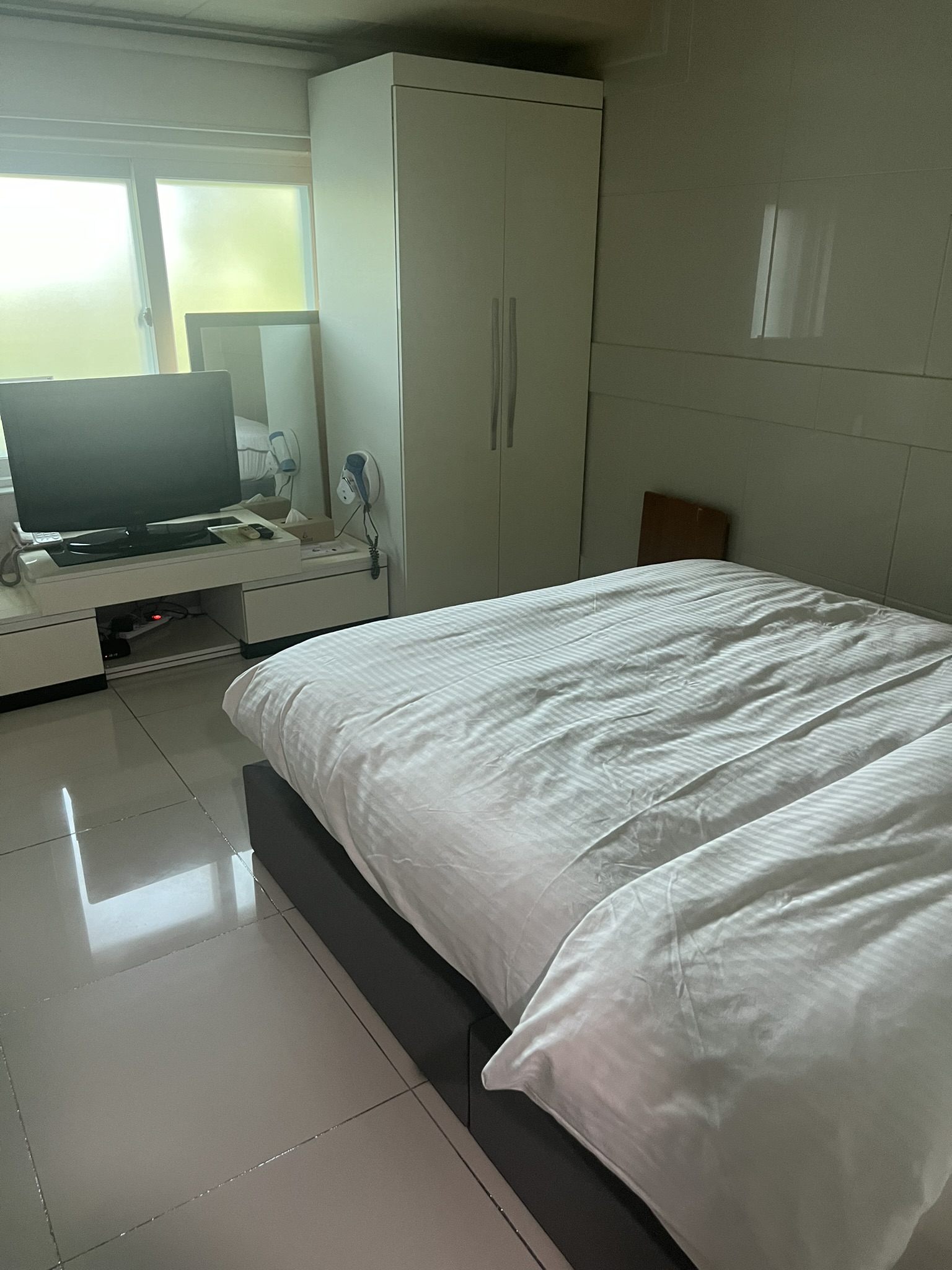 다른 블로그 리뷰에서처럼 방이 일견 깨끗해 보이기는 했다. 그러나 그건 인테리어가 올드한 화이트+대리석이라 그런 것이지, 매트리스엔 얼룩이 있었고 에어컨은 너무 지저분했다. 그런데 엎친 데 덮친 격으로 창문을 열기 어려운 구조였는 데다가 날이 너무 더워서 에어컨을 켤 수밖에 없었다. 원래도 알레르기 천식이 있는 나는 그다음 날부터 엄청 심한 목감기에 걸렸다...ㅠㅠ 종교가 문제가 아니다. 에어컨을 꼭 청소하십쇼... 방 안에는 평소 먹던 생수가 아니라 지장수가 있었는데 맛이 기존과 좀 달라서 맛만 보고 먹지 않았다.
